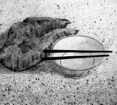 再凝视沙土地上的《老碗》,你会被那敏感的造型和惨淡、朴素、静穆的高灰色调,以及形式构成的内在之力所震慑,让人心头掠过阵阵悲怆。《老碗》是塞外古土上的一曲悲歌,倾诉着这一方土地的宿命人生。然而老碗、木筷、红薯所构成的画面和意境,却又使人在沉思中,真实地看到那一方土地的父老兄弟,背朝青天,面朝沙土地艰苦劳作,不可抗拒的人生史实和生生不息的精神。