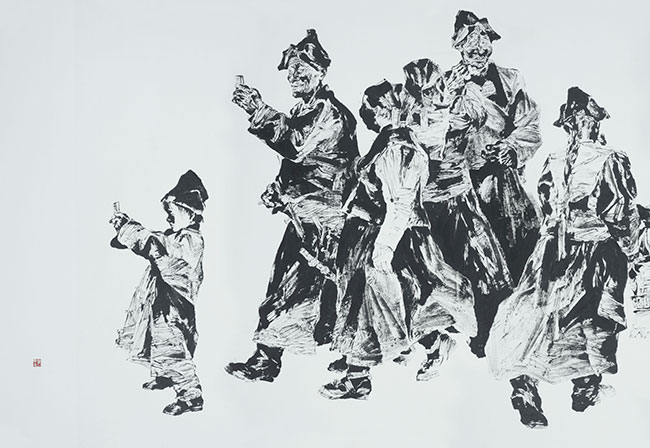 最近几年,殷会利的笔墨技巧日臻完善,创作出一批尺幅巨大,具有很强视觉冲击力的作品。比如有《祥光大巴扎》、《使鹿鄂温克的新生活》、《几代人》等。这些民族主题美术创作反映了他对丰富多彩民族文化的关注,同时也反映了他开放的艺术观念。《祥光大巴扎》表现新疆人民赶巴扎的场景。整幅画面人物众多,他借助线条的疏密、黑白的转换、墨色的轻重把集市上不同年龄性别的人物表现的井然有序,同时又不失热闹气氛。这体现了他画面构图的组织能力以及笔墨的驾驭能力,同时也反映出他扎实的素描造型功底。《使鹿鄂温克的新生活》是他最近两年创作的另一幅力作,画幅巨大,表现鄂温克人的生活场景。与《祥光大巴扎》一样,人物众多。这似乎是他的有意选择。在画面中安排大量人物,然后通过人物的组织安排,排列组合,形成一种高低错落的节奏感。通过画面取舍以及黑白色块整体感的强化,来达到统一中有变化、变化中不失统一的效果。他对画面整体视觉效果的强化没有抛弃细节,有时候画面的局部细节恰巧增强了节奏感。比如《祥光大巴扎》中柳条筐的刻画、《使鹿鄂温克的新生活》中摩托车的描绘,以及不同年龄不同民族人物神态特征的表现,都反映了他对细节的把握能力。