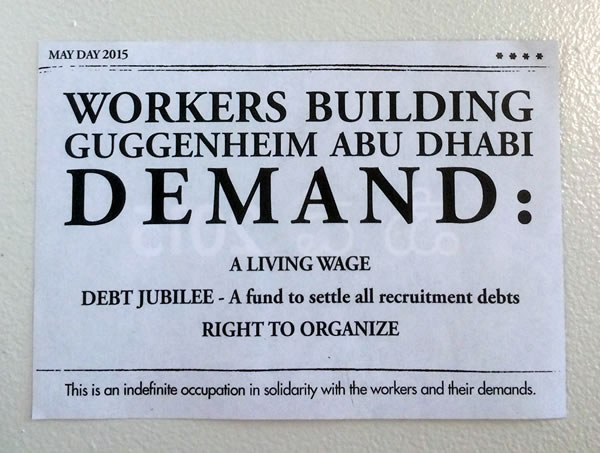 近日,一群抗议者占领了纽约古根海姆博物馆,希望能和博物馆层就博物馆阿布扎比项目中出现的种种的劳动权益问题进行对话。此次抗议由劳动权益组织GULF(Gulf Ultra Luxury Faction)组织,名为“The May Day ”行动。抗议者最开始在古根海姆的大厅中打出了“Meet Workers' Demands Now!”(满足劳动者权益!)的横幅,随后散发了大量的宣传册,并集体呐喊。在美术馆之外,一群工会组织也集中进行个抗议。