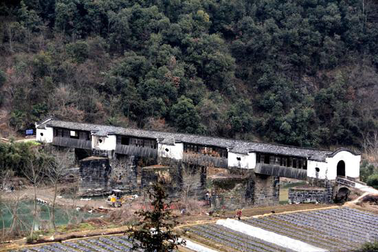 据了解,拱北古廊桥位于休宁县兰田镇岭下村,始建于宋代,为4墩5孔,全长70.7米,宽5米,高7.6米,是目前我省尚存最长的古廊桥,2012年被列为省文物保护单位。 1980年至2003年,休宁县政府先后4次对该桥进行维修。