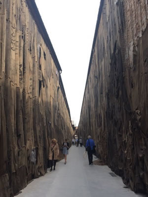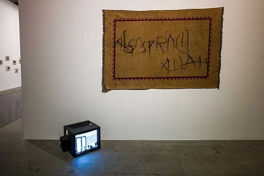 粗糙的地毯上笨拙的写着难以辨认的字迹,附带的视频文件显示这件作品是怎么制作完成的:包裹在毯子里的艺术家本人被一群男子抛向空中,每抛一次,便在地毯上标注一个符号,军械库展区入口也被阿贝德赛梅的另一件类似作品所包围,两侧的深墙全部覆盖上了麻绳和粗麻布,上面凌乱地散布着煤炭味的字符,极其震撼。