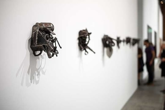 爱德华兹的一系列钢铁雕塑在展厅被面对面一字排开,观众可以从之间穿过。爱德华兹有很高的焊接技术,扭曲的斧头、铁链、手铐和锤头都有一种难以言状的意味,有可耻的恐惧、无益的、华丽的邀请,还有爱抚和欲望。这件作品同时还借用非洲面具和未来的战争武器元素,复杂地述说着暴力和奴役。