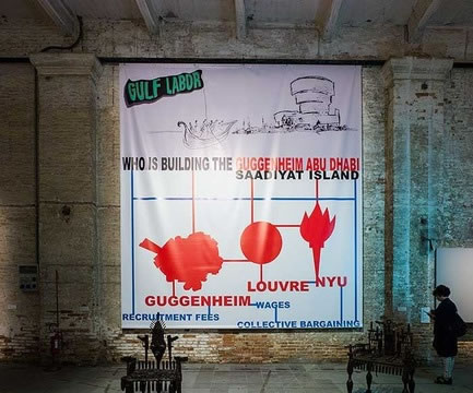 总策展人奥克维·恩威佐的理念涉及广泛主题诸如资本主义、殖民主义和不平等,Gulf 组织的作品《谁在建设的阿布扎比的古根海姆(2015年)》似乎更着眼于艺术世界的问题,2010年以来,这个国际艺术家团体已经开始关注农民工在阿布扎比建设文化中心这件事情。这次在军械库展出的是一张描绘有简单图像的大海报:古根海姆博物馆、卢浮宫和纽约大学正在石油资源丰富的酋长国开发项目却忽视工人的利益。这是Gulf 组织2015年第二次在意大利为海湾劳动伸张正义:不久前曾意大利贾尔迪尼通过iPad设置了20个问题进行民意调查,但这次无疑是更生动的呼吁。