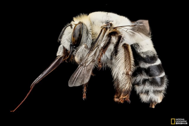这只Hylaeus modestus只有一粒米的一半大小,在华盛顿特区附近被科学家捉住。它的头部太小了,以至于Droege不得不用毫针固定它并拍照。