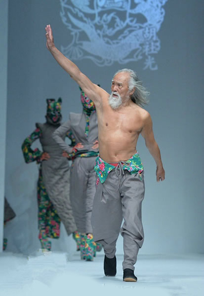 在《重返二十岁》中饰演李大海的王德顺老爷子为胡社光时装发布会开启序幕