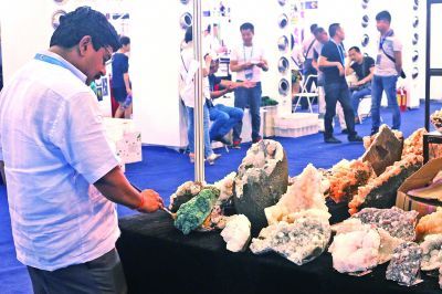 阿杜的这块矿物晶体小天地,只不过是现场来自83个国家和地区的数百展馆中的一家。这些形形色色的展馆,从世界各地带来了过10万件的矿物宝石,除了有专业收藏者才熟悉的菱锰矿、香花石、方解石、紫萤石、重晶石、孔雀石等矿物精品外,也有大众收藏者常见的红宝石、蓝宝石、绿宝石、翡翠、和田玉、玛瑙、水晶、琥珀、绿松石等珠宝玉石产品。