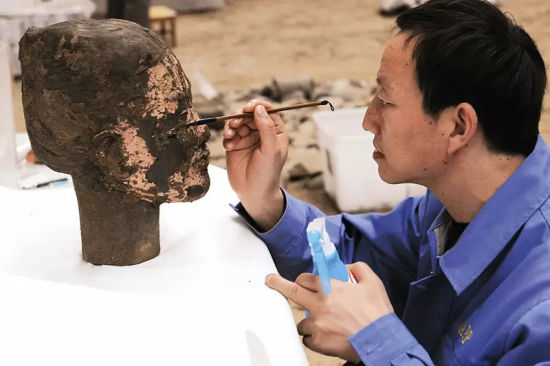 而对于二号坑,如果挖掘到棚木阶段停顿很久不做处理,对下面的彩绘文物非常不利。从一号坑的第三次发掘开始,文保部门的工作人员已经在和考古人员一起工作。“发掘的时候要喷水,土壤中的湿度是在不断变化的。我们埋在地下有个传感器,可以测量温度、含水率还有电导率。通过这三个指标,我们能够判断挖掘到距离彩绘俑多深的时候,会对它产生剧烈影响,那么可能考古人员清理到这个地方,就要迅速加快速度。否则时间拖延,虽然地表看不出来,但是地下彩绘文物已经受环境影响在发生变化。”博物院文物保护修复部副主任夏寅告诉本刊。从这个意义上说,二号坑二次发掘是第一阶段的必然延续。