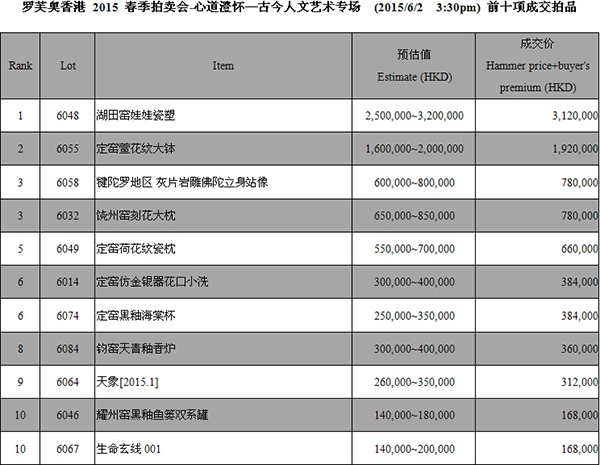 罗芙奥香港2015春拍于6月2日圆满落幕,“心道澄怀-古今人文艺术专场”承蒙各界藏家厚爱,总成交额为10,891,800港币。首次尝试以宋瓷配合水墨的专场方式,即可反映当下人文风气的高涨,其中水墨作品表现尤为凸显。此专场总计拍品94件成交拍品45件。