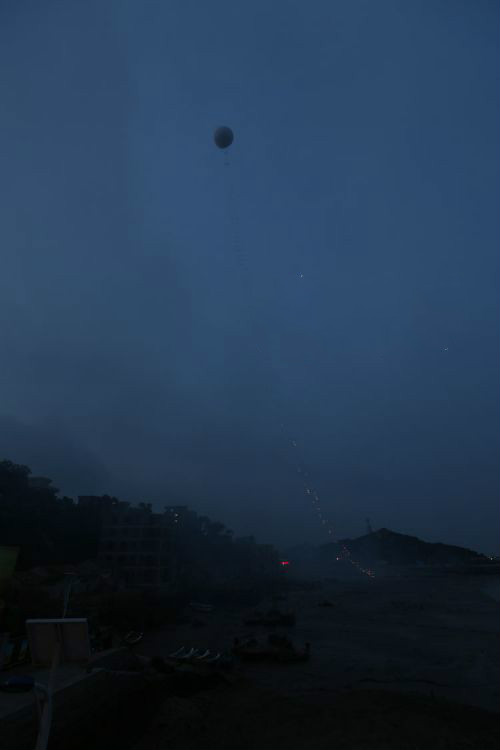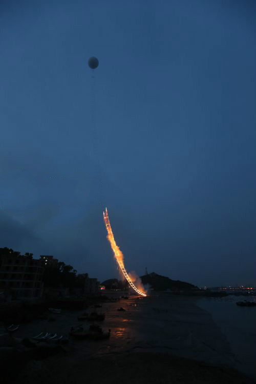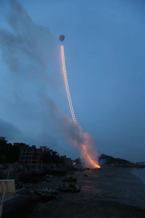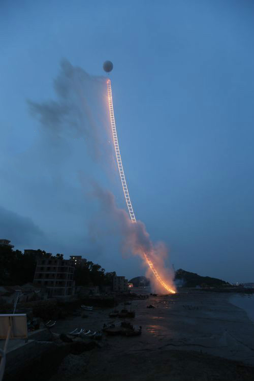 6月15日上午4时50分许,著名艺术家蔡国强在家乡泉州泉港区惠玙岛点燃500米《天梯》,迎着晨曦对话宇宙。《天梯》首先在地面铺一条500米高、5.5米宽的绳梯,借助系留球将它拉起,垂直升入夜空。点火后,好像一座金色焰火梯子刹那间拔地而起,带着人们仰望天空,与无限对话。