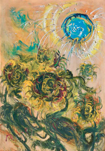 在这件作品中,极其活跃而具表达性的笔触似乎为向日葵注入新生,让主题充满生命力,欣欣向荣。它们沐浴于日光中欢乐舞蹈,歌颂着它们环境的温暖。阿凡迪利用独创的手绘技法,为普通的画面增加质感、动感与深度。