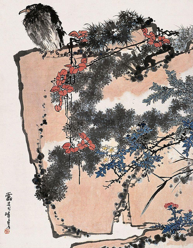 潘天涛作品《鹰石山花图》