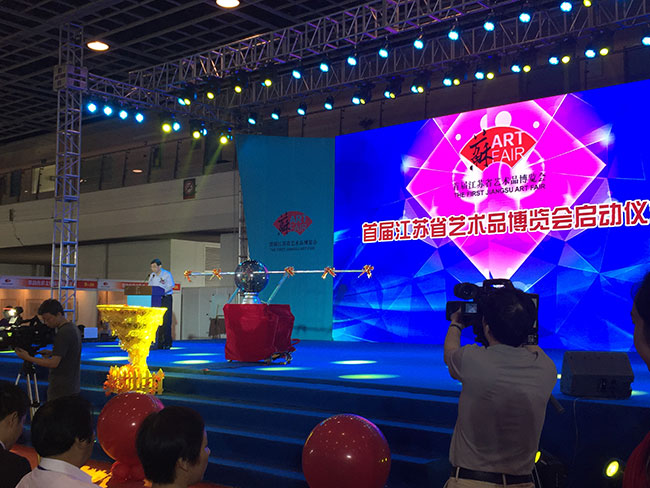 开幕式由江苏省文化厅副厅长秦基春主持,当项兆伦、周涛、曹卫星推动启动杆,标志着首届江苏省艺术品博览会正式启幕。