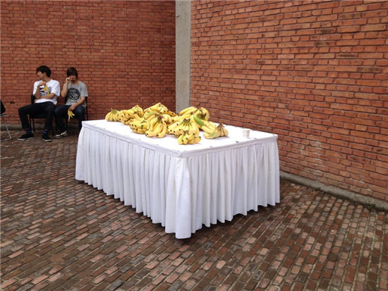 十几平米的空间展示了艾未未购藏的几件玉器,包括一个玉斧与从上面掏下来的一个iPhone的形质(玉斧的厚度刚好跟iPhone相近),一件商周时期的柄形器,一块中心有洞的大石头,以及两件玉石小件。早上的开幕现场,人气不减,在空间外还备有现做的早餐和香蕉。
