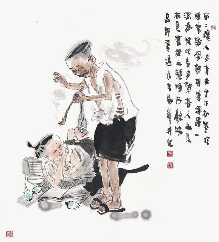 王家训的人物画创作题材十分丰富,有高人逸士、有仕女孩童,又有重彩工笔、人物写生。无论哪种类型的题材,王家训都能以独特的表现手法来表达个性鲜明的人物形象。他画中的人物,在相貌、服饰及背景环境上也不追求形似,他注重以画意和气韵来抒发自己的情感。