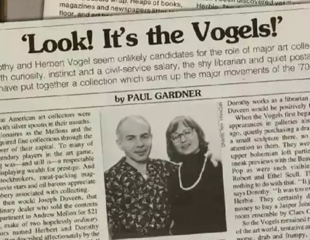 这样一个简单的道理被工薪阶层出身的沃格尔夫妇用50年的收藏人生诠释得淋漓尽致。这对看上去十分不起眼的夫妇过着极简朴的生活:住在纽约一个租来的四十多平方米的公寓里,去便宜的社区餐厅和中餐馆吃饭,从1970年代之后就不再去欧洲旅行。丈夫在邮局工作,工资用作购买艺术品;妻子是图书管理员,收入负责生活开支。尽管赫伯特的年收入从未超过23000美元,但他们在50年间收藏了将近五千件艺术品。