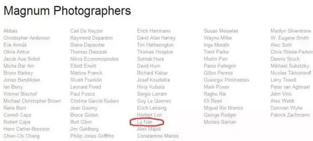 赶紧跑去玛格南官网一看,头条倒没有新闻公布,但摄影师的名单里确确实实有“Lu Nan”的大名(见上图)。