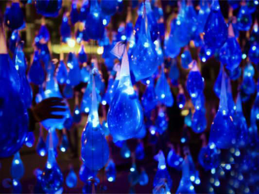 利用蓝色的水和LED灯,营造出梦幻的空间,而特大型的避孕套则是非常优质的材质。设计师们将充蓝色水的避孕套扎成巨大的水滴状,这些大水滴有着凌然难以描述的愉悦的触感,而且不惧怕挤压。设计师们将这些蓝色发光大水滴悬挂成一个方形的空间,悬浮在空中。人们可以走入其中,并聆听水轻柔的流动的声音。