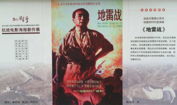 记者在现场看到,三四十米的围墙上,除了《铁道游击队》,还有《鸡毛信》、《地雷战》、《地道战》、《平原游击队》、《小兵张嘎》等共30幅抗战电影海报展览。