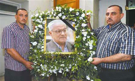8月23日,在叙利亚首都大马士革的国家博物馆,家属在追思会上手举哈立德·阿萨德照片。