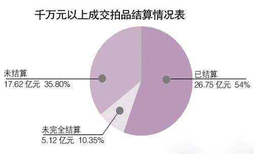 报告显示,在去年成交的藏品中达千万元的作品共有232件,其中,完成结算的拍品有130件,货款为26.75亿元;未完全结算的作品有20件,涉及货款5.12亿元;而未结算的作品达82件,涉及货款17.62亿元。不难看出,国内艺术品拍卖千万级拍品的按时结算率非常低。据悉,拍卖行为了加速回款进度,会调剂佣金,即买家在不同的时间段付款,佣金会有不同程度的优惠。