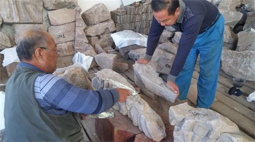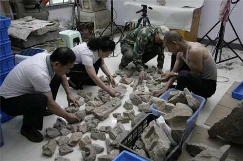 考古工作人员正在对出土的130多块西立佛石块研究分析。