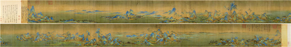 《千里江山图》为中国北宋青绿山水画作品,中国十大传世名画之一。纵51.5厘米,横1191.5厘米,绢本,青绿设色,无款。王希孟以“咫尺有千里之趣”的表现手法和精密的笔法,在画中描绘了祖国的锦绣河山。画面千山万壑争雄兢秀,江河交错,烟波浩淼,气势十 分雄伟壮丽。山间巉岩飞泉,瓦房茅舍,苍松修竹,绿柳红花点缀其间。山与溪水、江湖之间,渔村野渡、水榭长桥,应有尽有,令人目不暇接。