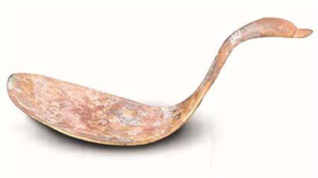 在我的收藏中,唐代鹅形金砚滴算是最珍贵的藏品。它呈S形,鹅形神态,乍看上去,如同一只金汤匙。每每上手把玩,总让人爱不释手。我收藏的这件宝贝,不仅造型奇巧,还把我带上了另一条艺术之路,实乃人生当中的庆幸之物。