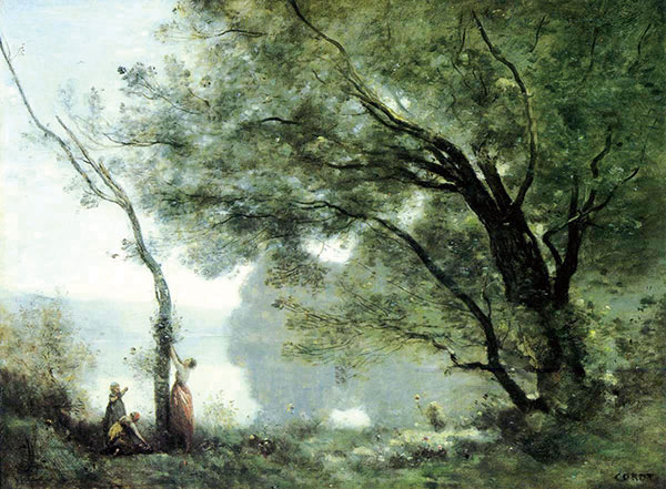虽然,19世纪法国印象派准确捕捉到光影与自然界的色彩关系,以其活泼鲜跳的笔触变化引人注目,改变长期以来陈旧灰暗得如死水一潭的调子,但是,仅靠其漂亮的色彩层次及热情欢快的画面,还是无法达到像柯罗那样富有诗情画意的风景画内涵,那是一种妙不可言的感觉。因为在这些画里,有一种能直逼人类内心情感的东西——如梦幻般的艺术情调诗意的表现。通过这一布局表现,柯罗把一种朴素轻灵般的笔法,以色调柔和得就仿佛被一层银灰纱幕般笼罩着的画面,向我们展示了一种带有感伤色彩和浅浅入梦的诗情画意来。