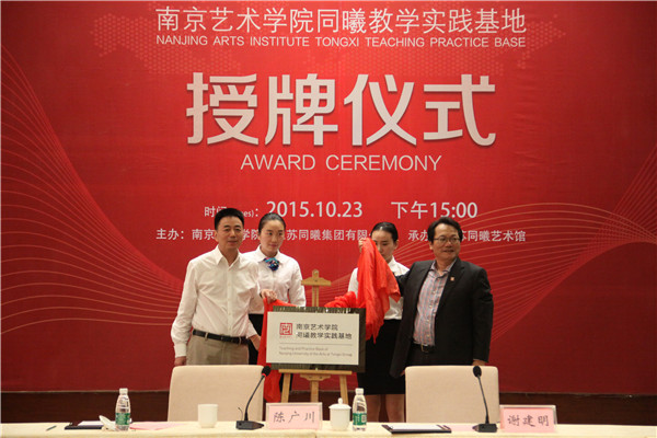 2015年10月23日下午,南京艺术学院同曦教学实践基地授牌仪式在同曦艺术馆隆重举行。出席此次授牌仪式的双方领导有南京艺术学院党委常委副院长谢建明、南京艺术学院发展规划与社会合作办公室主任顾新跃、科研处处长王晨、美术学院党总支书记兼副院长李彤、党委宣传部副部长宋德泳、美术学院党总支副书记吴志华、美术学院副处级调研员陆根生、高职院成教院副院长严明、艺术设计院院长戎卫军、高职院成教院考级办唐素梅、发展规划与社会合作办公室张海霞,以及同曦集团董事长陈广川、常务副总裁吕平、副总裁季长宁、总工程师单峰、管委会成员胡茂琦。
