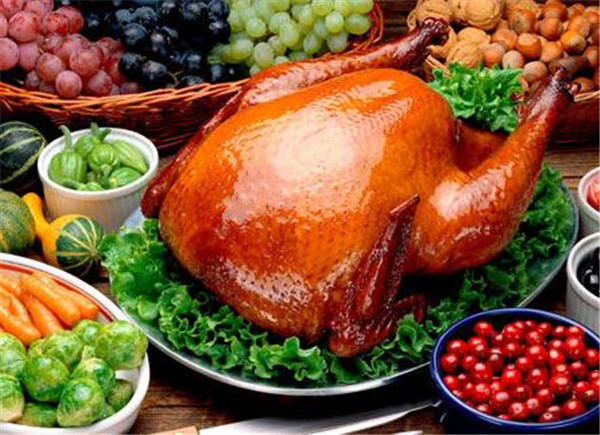 感恩节的晚宴是美国人一年中很重视的一餐,火鸡和南瓜饼都是必备的。