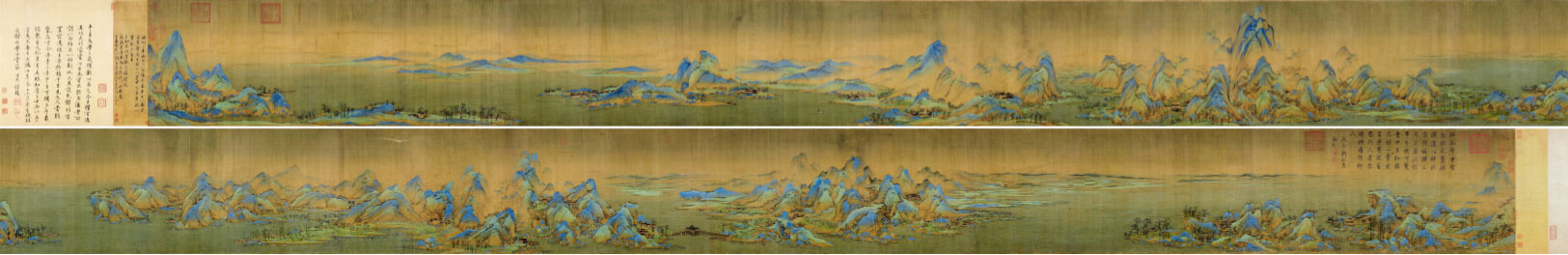 《千里江山图》为中国北宋青绿山水画作品,中国十大传世名画之一。纵51.5厘米,横1191.5厘米,绢本,青绿设色,无款。王希孟以“咫尺有千里之趣”的表现手法和精密的笔法,在画中描绘了祖国的锦绣河山。画面千山万壑争雄兢秀,江河交错,烟波浩淼,气势十分雄伟壮丽。山间巉岩飞泉,瓦房茅舍,苍松修竹,绿柳红花点缀其间。山与溪水、江湖之间,渔村野渡、水榭长桥,应有尽有,令人目不暇接。