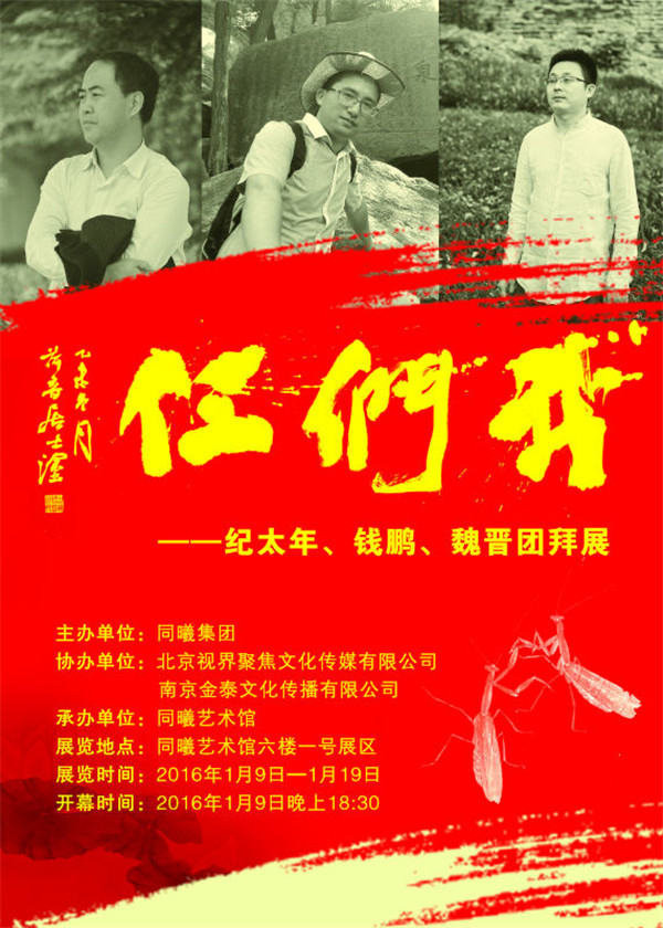 由同曦集团主办,北京视界聚焦文化传媒有限公司、南京金泰文化传播有限公司协办,同曦艺术馆承办的“我们仨——纪太年、钱鹏、魏晋团拜展”作为同曦艺术馆2016年开年盛宴将于1月9日隆重登场。届时,展览将首度以艺术沙龙的形式,汇集众艺术家及知名媒体共同打造一场精彩无限的同曦艺术之夜,诚邀您的到来参加!