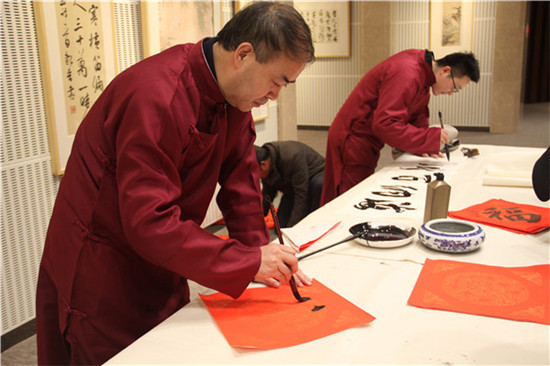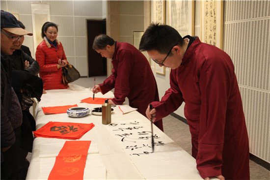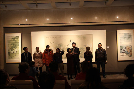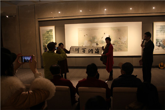 作为本次活动的承办方,同曦艺术馆对此次开幕酒会也是非常的重视,充分利用了同曦集团旗下的各种资源,为整个开幕酒会设置了丰富多彩的节目。江苏省文化发展基金会柯江处长、同曦集团总裁助理胡茂琦、本次参展艺术家代表纪太年老师先后发表了热情洋溢的讲话。同曦大圣篮球队拉拉队篮球宝贝带来的劲歌热舞;同曦艺术馆四位美女的歌舞表演《小冤家》、两大“男神”的倾情献唱赢得到场嘉宾的阵阵喝彩。到场的画家和媒体代表也毫不吝啬的送上了最为诚挚的新春祝福;最后更是安排了互动环节,通过现场抢答的方式,让到场的艺术爱好者中的幸运儿收获了参展艺术家的作品作为奖品。酒会随后也热烈开场,到场的各界嘉宾尽情享用美酒美食,而参展的三位艺术家瞬间成为了现场的焦点,合影的人络绎不绝。