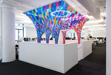 SOFTlab受behance的委托,为他们在纽约的新办公室设计一个装置作品,鉴于他们的办公室内部基本都是白色光滑的表面,SOFTlab决定为他们增添一丝色彩。这间办公室有两层,楼梯位于正中央,这里就是放置装置作品的最佳位置,因为它连接着一层和二层,从办公室的任何地方都能看到。该装置作品就像一扇彩色玻璃窗一样,将色彩投射到周围的环境中。