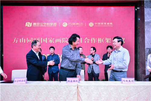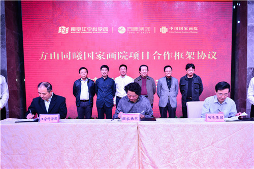 开幕式上中国国家画院、江宁科学园发展有限公司、同曦集团三方还签订了“方山同曦国家画院项目合作框架协议”,根据三方意向,拟在江宁高新园投资国家画院创作、创新基地,并具备医疗养生等配套服务项目,总投入在十个亿左右。建成之后将是南京又一重量级文化基地。