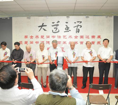 本次展览将展出寒暑六载、八易其稿以战国楚文字精心创作的《楚简书道德经》百米长卷;楚简书法作品一百幅。展览将于15日结束。北京首展后,“李金泰楚简书法艺术全国巡回展”将在武汉、上海、宁波、深圳、广州、成都等地陆续开展。