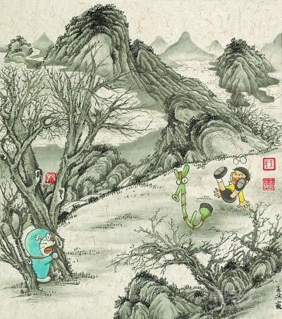不过,在遵循古法的前提下,如何将动漫人物自然而然地融入古代作品,还要费一番思量。每次动笔前,王赫考虑最多的就是寻找人物与环境的契合点。比如在狂风大作的背景中,哆啦A梦也会被吹得东倒西歪,而在水流湍急的山涧瀑布,王赫又会把他画在安全可靠的“漂流瓶”里。