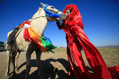 7月26日,艺术家孔宁在内蒙古达茂巴音宝格达与马举行婚礼,为其历经十天的行为艺术《嫁达茂蒙古马》画上完美句号,并成功将其亲手制作的婚纱作品“萨如拉红宝石”献给蒙古马和大草原。吃苦、耐劳、坚韧、勇敢是蒙古马的精神也是草原精神。孔宁牵着白马行走草原表达了对蒙古马永恒的爱,她最终嫁给了蒙古马的精神,也表达了人类追寻蒙古马一往无前的精神。