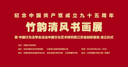 2016年9月24日至26日,纪念中国共产党成立九十五周年“竹韵清风”书画展在江苏同曦艺术馆隆重举行。此次书画展由中国行为法学会主办,中国行为法学会法治中国文化艺术研究院、江苏省泽心信息有限公司承办,中国法官协会法院文化分会、北京古道兰亭艺术馆协办、江苏同曦艺术馆。