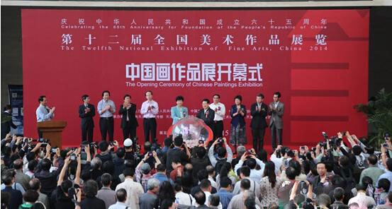 2014年9月26日上午十时,“第十二届全国美术作品展览中国画作品展”在位于海河之畔的天津美术馆隆重开幕,荟萃全国的591件入选作品以及评委作品布满三层展厅。中国文联党组书记、常务副主席,第十二届全国美展组委会名誉主任赵实,天津市委副书记、市长,第十二届全国美展组委会名誉主任黄兴国,中国文联党组成员、副主席、书记处书记,第十二届全国美展组委会主任左中一,中国文联副主席、中国美术家协会主席,第十二届全国美展组委会主任、中国画展区组委会名誉主任刘大为,中共天津市委常委、宣传部部长、第十二届全国美展中国画展区组委会主任成其圣,天津市副市长,第十二届全国美展中国画展区组委会主任曹小红,文化部办公厅副主任陈发奋,中国美协分党组书记、常务副主席、第十二届全国美展组委会副主任、中国画展区组委会主任吴长江,中国美协副主席、国家画院院长杨晓阳,中国美协副主席何家英等出席了开幕式,开幕式由天津市文联党组书记寇士恺主持。