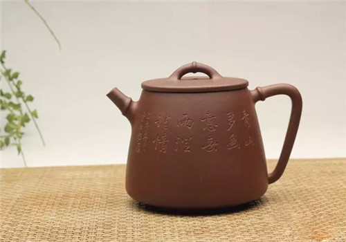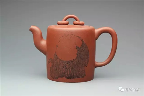 此壶清水泥为胎,壶身做高圆筒状,平盖内嵌,桥钮并饰活环,三弯流,圈把,直腹,内凹圈足。整体气韵非凡,线条简约。壶身刻绘布袋和尚,惟妙惟肖。整壶线条流畅细腻,形制典雅。