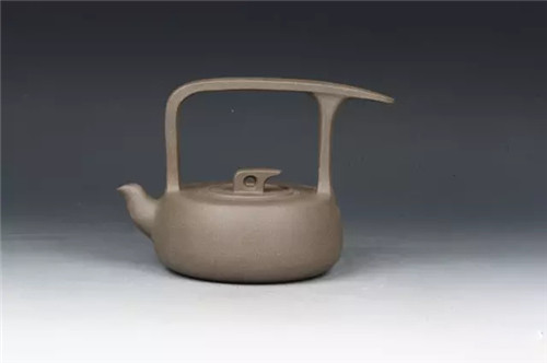 此壶为紫砂二厂2015年为纪念“百年景舟”设计创研的六把顾景舟大师传世壶器之一。此壶原造型为1988年由韩美林设计,顾景舟制作。其特点为直线与弧线交错运用,转折处明快流畅。提梁及盖的设计新颖、大方、突出。整体制作形成圆中有方、方中带圆的构图特色,充分掌握运用了雕塑空间关系的美学概念。壶身丰厚扁圆,稳住了上半部的飞扬动势,为整体的造型起到了关键作用。流则浑厚有力。远观此壶有如飞鸟于天之感。