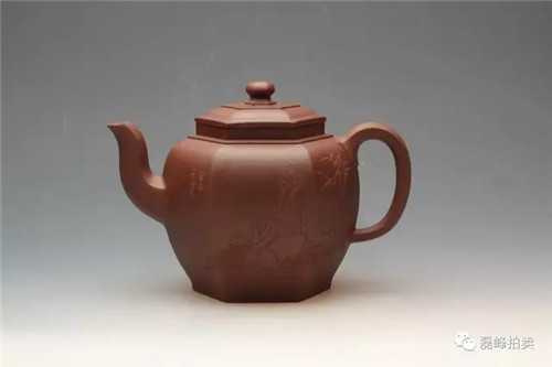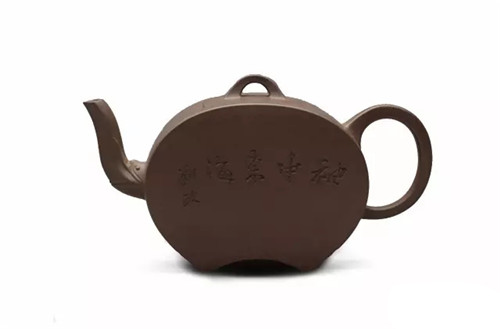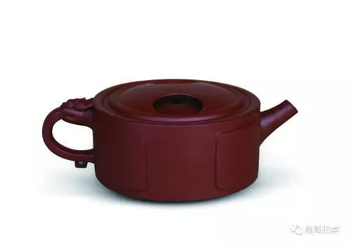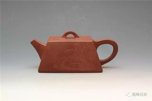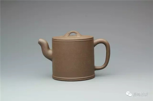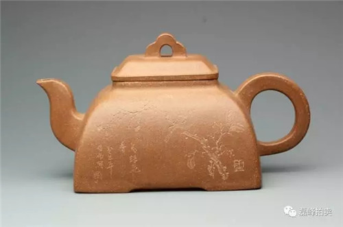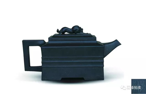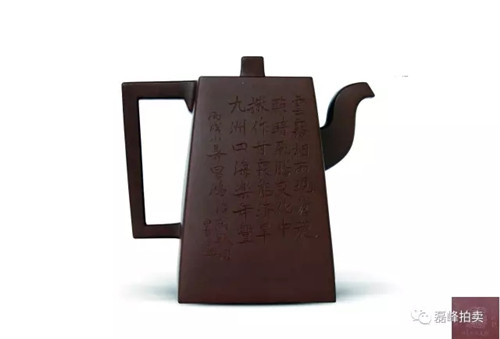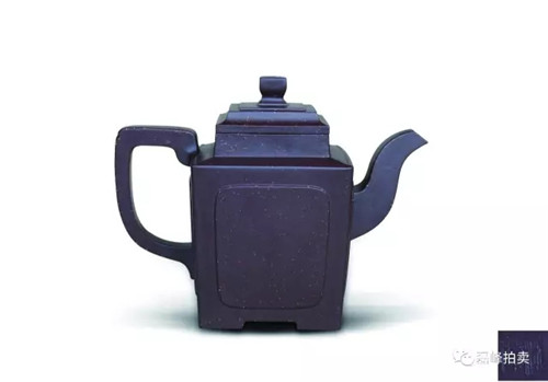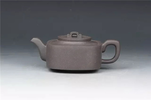 壶体呈方形,方形束直颈,平盖上有方门形纽,长弯流,方折端把,清秀大方,简单朴素中见余味。