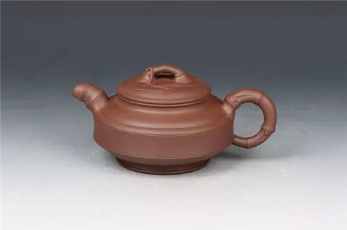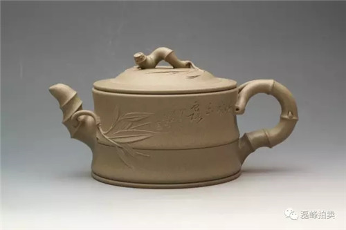 此壶为紫砂二厂2015年为纪念“百年景舟”设计创研的六把顾景舟大师传世壶器之一。双线竹鼓壶是一种传统壶式,器形工整,雍容大方。明清时,流行于民间的“竹系”壶中的“鼓型”款式,层出不穷。近代,在“花器宗师”朱可心老人手里得以九九归一,造型被统一下来。此后,顾景舟大师再出此款,并另出传世新意:壶以竹为题材,夸张变化成形,壶身塑成主干,竹节简洁有致,中正沉稳。流、把化为新抽嫩枝,动势内酝,生动有力。盖上堆塑屈曲的竹枝为桥形钮,钮下贴塑竹叶纹饰。盖口平整,光滑细腻,端庄高雅,是罕见的珍品。