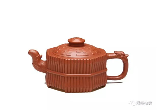 壶盖浮雕八卦图,盖钮成太极图,设计极富中国传统文化意味。器身造型以细竹围成,工整而光洁,意境自然,腰间束带以圆竹装饰,壶流、壶把则饰以飞龙形象,别有生趣,将易学哲理巧妙地构思于紫砂壶上。