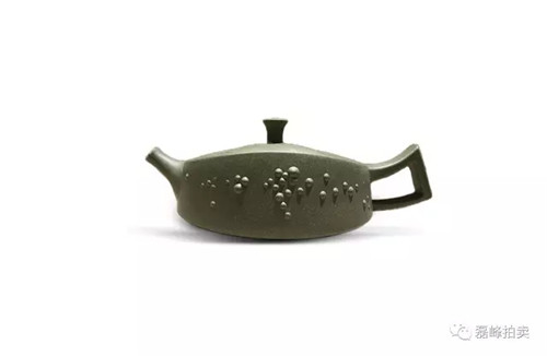 作品生动简约,清新优雅,以农家豆蔬为题,尽得山野淳朴、无半点世俗气。壶嘴以叶包卷成,构思巧妙。叶上经脉清晰可见,壶把以藤弯曲成,纹理遒劲有力。藤叶上分出一支蔓,绵延攀附于壶身,增加画面表现力度,壶侧挂下来的两颗佛豆,鲜活可爱,为点睛之笔。