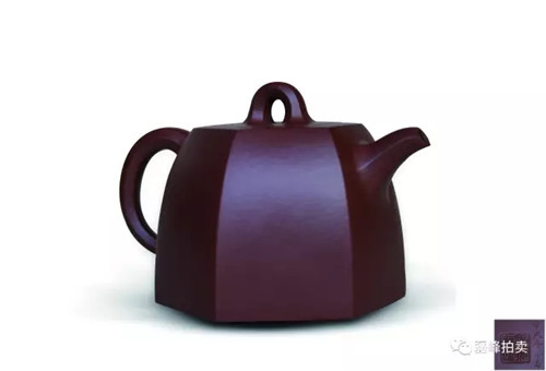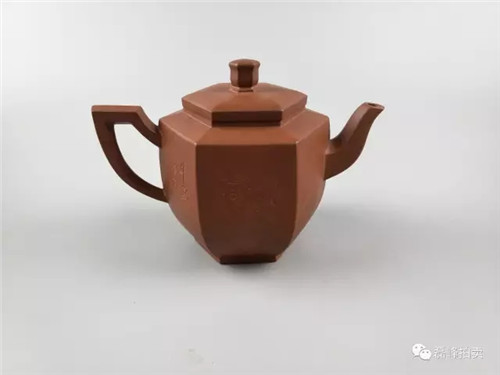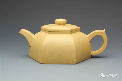 此壶段泥制成,泥色均匀。六方棱形,盖圆,圆珠钮,弯嘴,圈把。壶型规整,方圆结合,线条清晰流畅,块面弧度过渡自然,身筒六方稳重端庄,环耳把暗接而出,与整器融为一体。