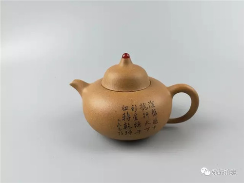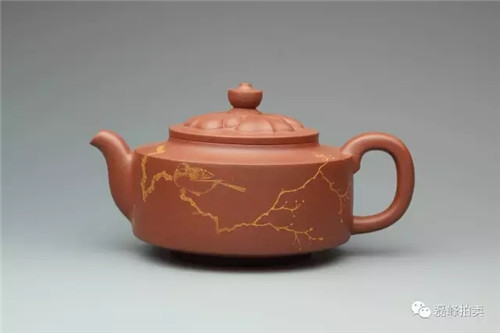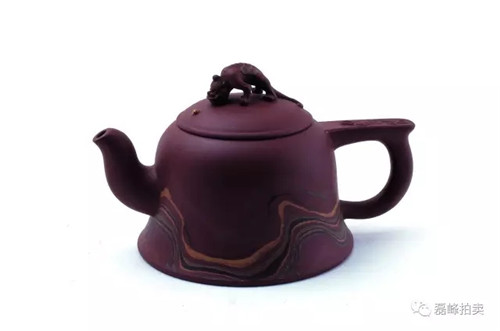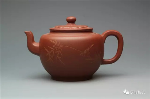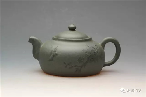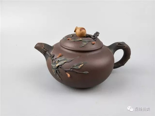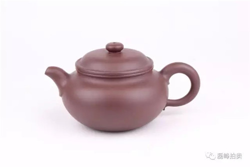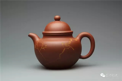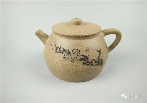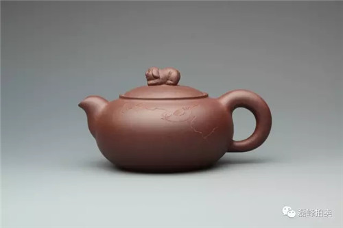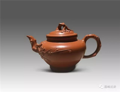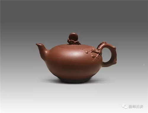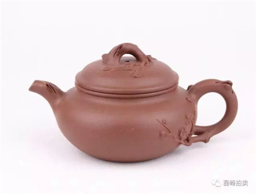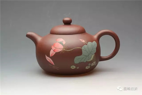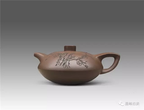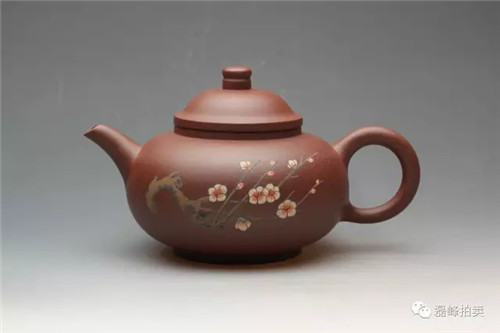 此壶器型端庄,整体充满张力,如圆球被盖压扁,球中之气又把盖冲起,柱型之盖的再把盖压下,壶把如弯弓一放即弹,咀线从壶底上拉,自然而又刚劲。壶身以彩绘一截梅花,作珐琅彩装饰。