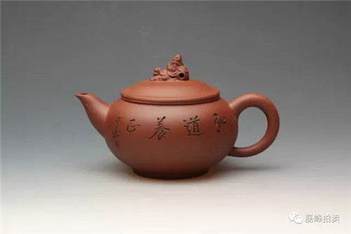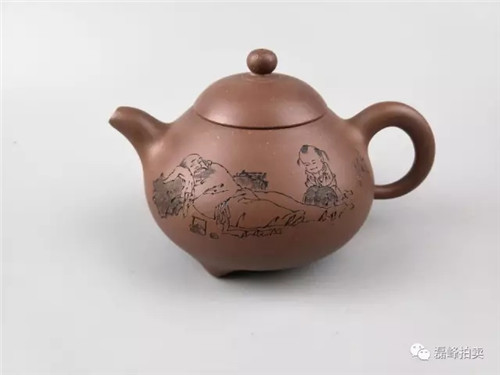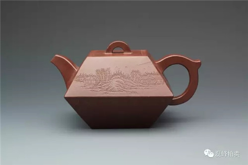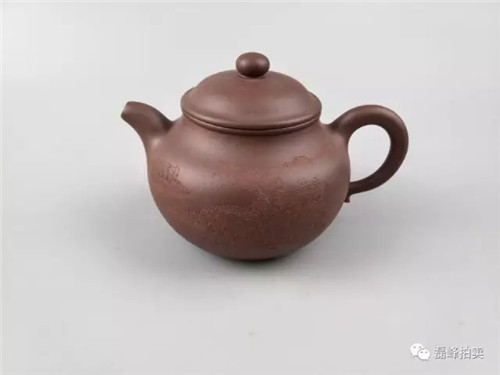 此壶朗朗大度,形貌伟岸,胎质细腻厚实。纵观全器敦实稳重,浑朴古雅,充实饱满,配件线面遒劲,展现出莲子壶式少见的雄伟之美。壶身陶刻仿古意山水画。