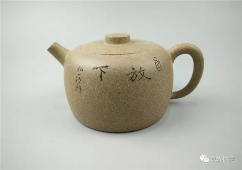 紫泥砂质,系合欢壶式,却异于典型壶式。壶身上下合盘,其腰部无明显凸棱,似如扁珠,剑流上弯,圈把圆润,壶盖穹起,算珠壶钮居中,做工不俗。壶身由著名画家张传斌题画“狗头鱼”。